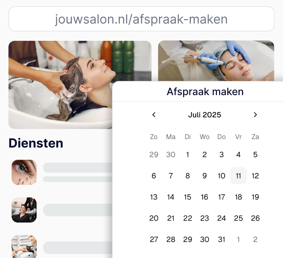 Geef je klanten de vrijheid om zelf een moment te kiezen dat voor hén werkt. Of het nu overdag is of ’s avonds laat – met online zelfplanning verlaag je de drempel, verhoog je het aantal boekingen en laat je zien dat je met de tijd meegaat.
